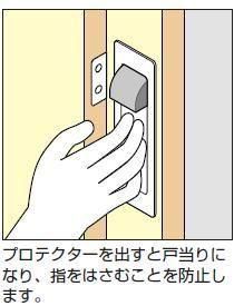 左下の図の様に、プロテクターを出すと戸当たりになり、指を挟む事を防止します。