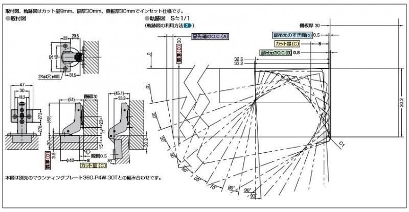 ラプコン搭載オリンピアスライド丁番H360厚扉用 93°開きインセット