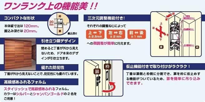 ●丁番は扉側と枠側に分割でき、扉を枠に仮止めする機能が付いているため