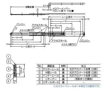 ●表の耐荷重は、引き出し側レールを伸ばした時のレール中央部での静止荷重です。