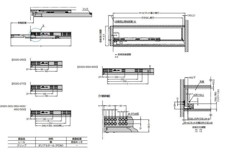 ●三次元調整機能付です。ダイヤル操作で引き出しの位置を上下2.5 mm、前後3 mm、左右±1.5 mmの範囲で調整できます。