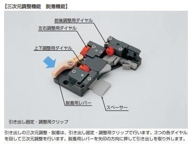 ●三次元調整機能付です。ダイヤル操作で引き出しの位置を上下2.5 mm、前後3 mm、左右±1.5 mmの範囲で調整できます。