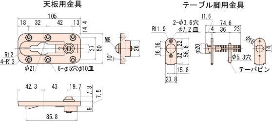 写真左より、天板用金具、テーブル脚用金具、テーパーピン